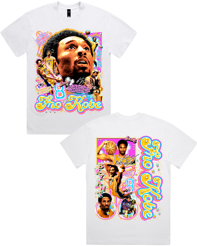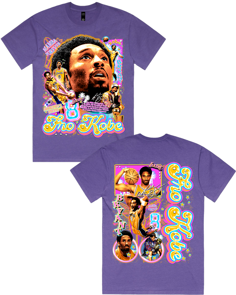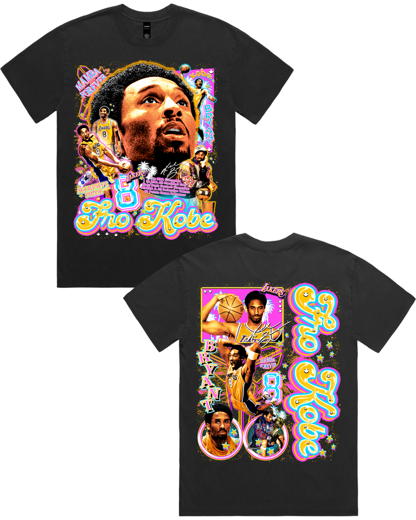 The Fro Kobe Garment Dyed Heavy Weight Bootleg Tee pays homage to a basketball legend in his prime. Crafted from 100% carded cotton at a substantial 7.1 oz weight, this tee combines durability with comfort for everyday wear. The garment dyed finish creates a distinctive faded aesthetic available in Faded Violet, Faded Black, and Faded White. Preshrunk to minimize shrinkage. Direct-to-garment printed with jumbo artwork on front and back, delivering crisp, high-quality graphics that feel premium to the touch. Relaxed, oversized fit—size down for a traditional fit.