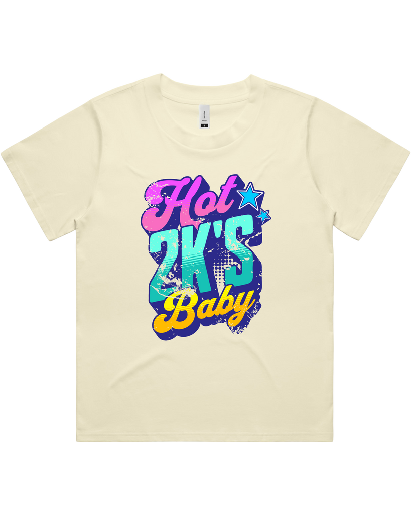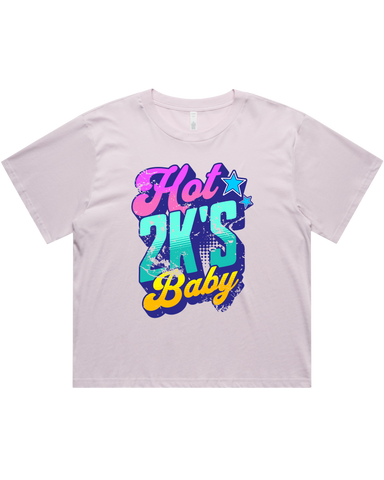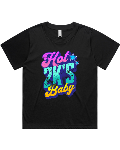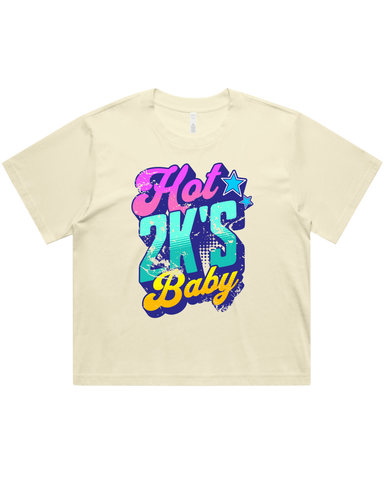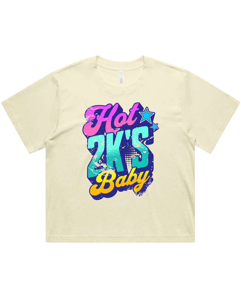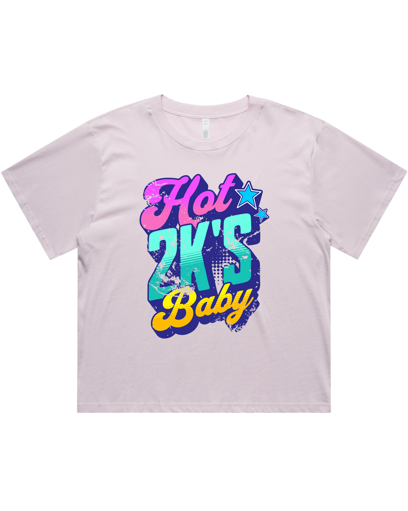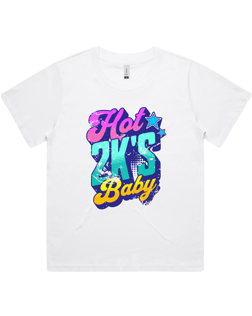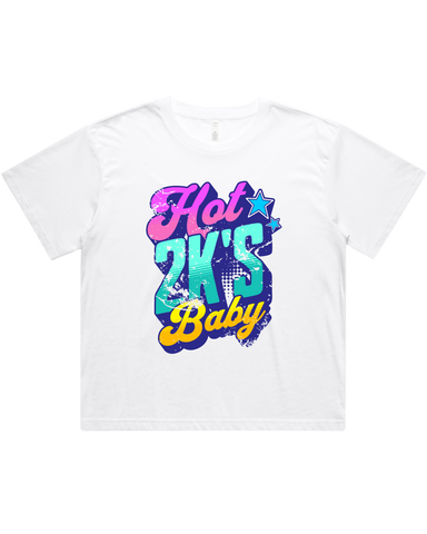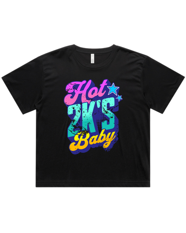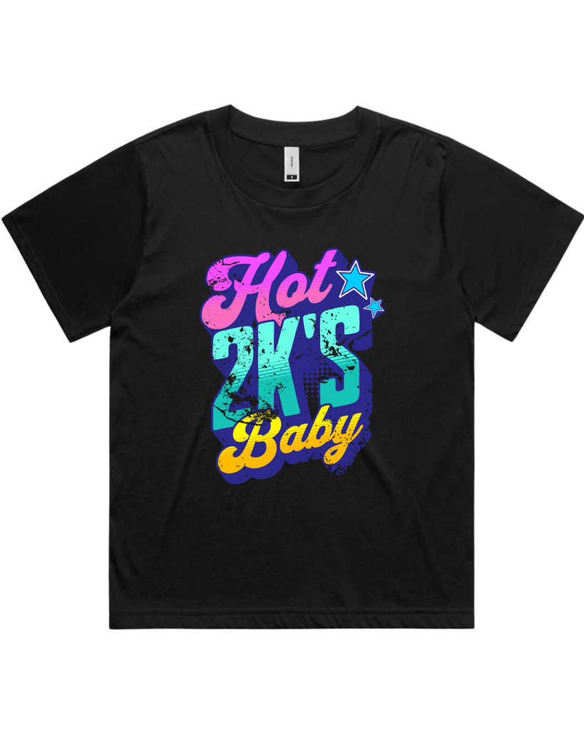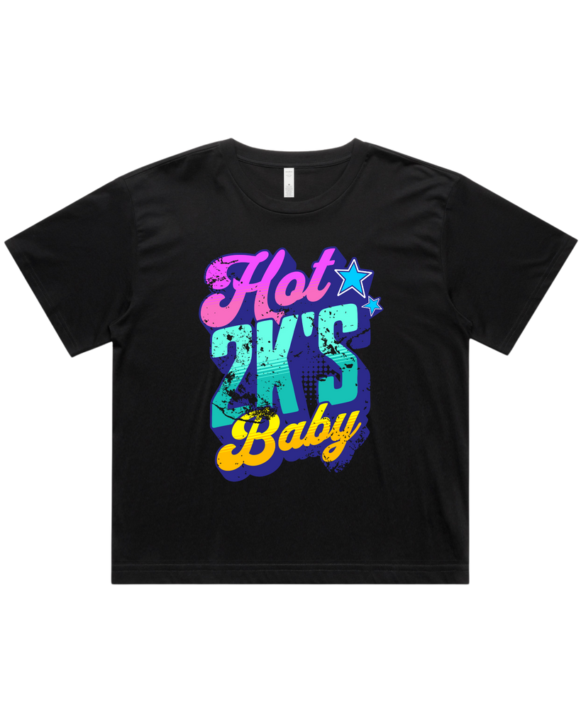 Upgrade your wardrobe with our Womens Hot 2K's Baby T-Shirt! Made of 100% combed cotton, this relaxed fit tee features an oversized drop shoulder and a trendy crop top design. The mid-weight fabric ensures comfort while the pre-shrunk design minimizes shrinkage. Size down for a traditional fit. Feel confident and stylish in this must-have piece!