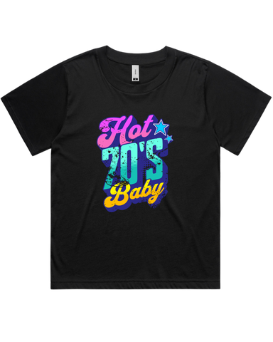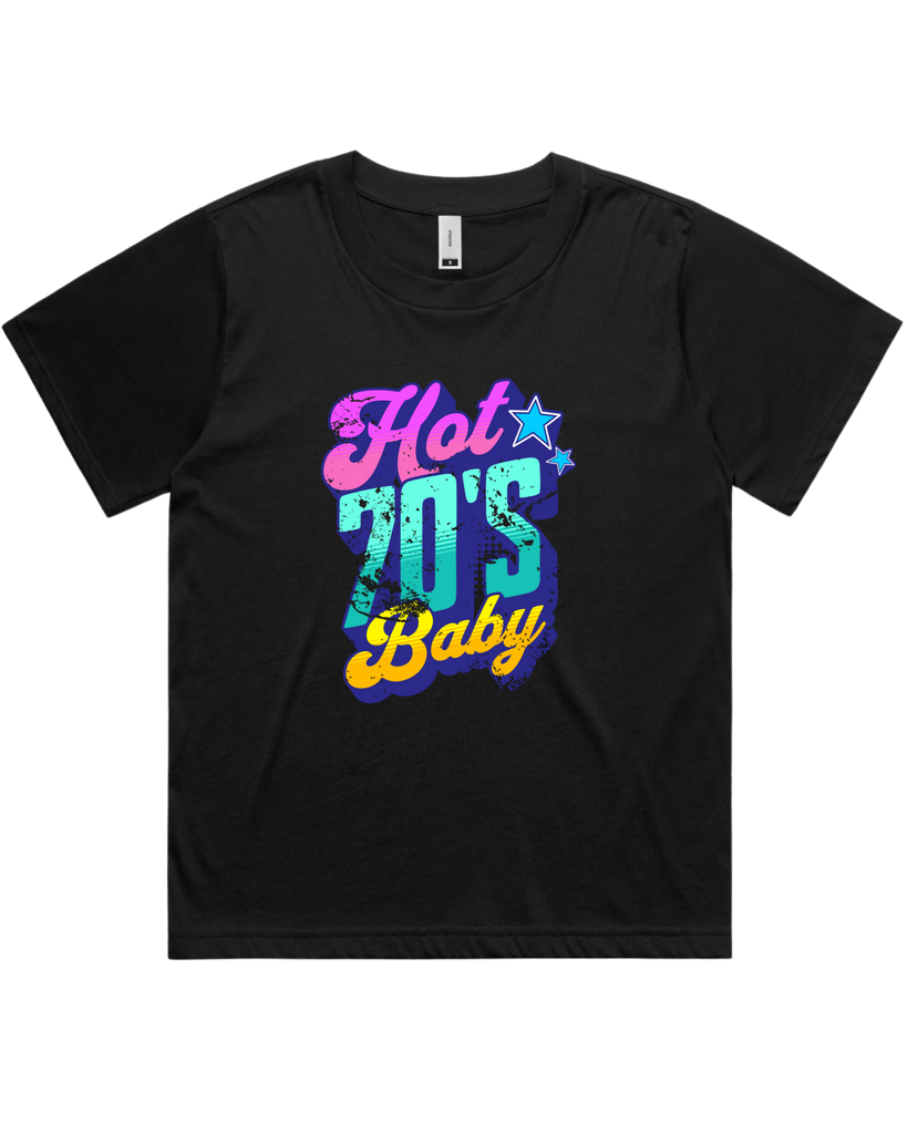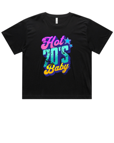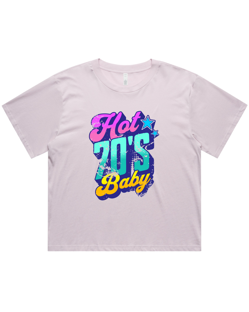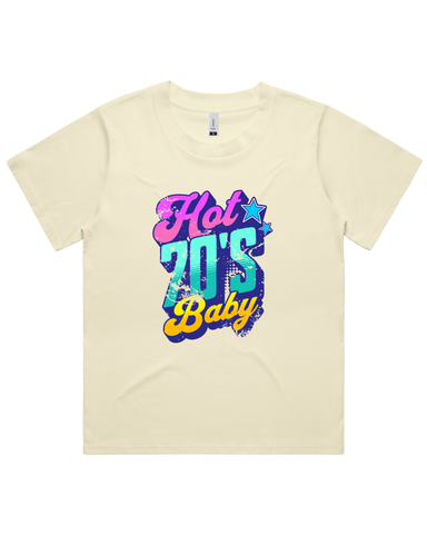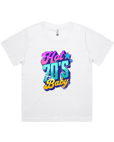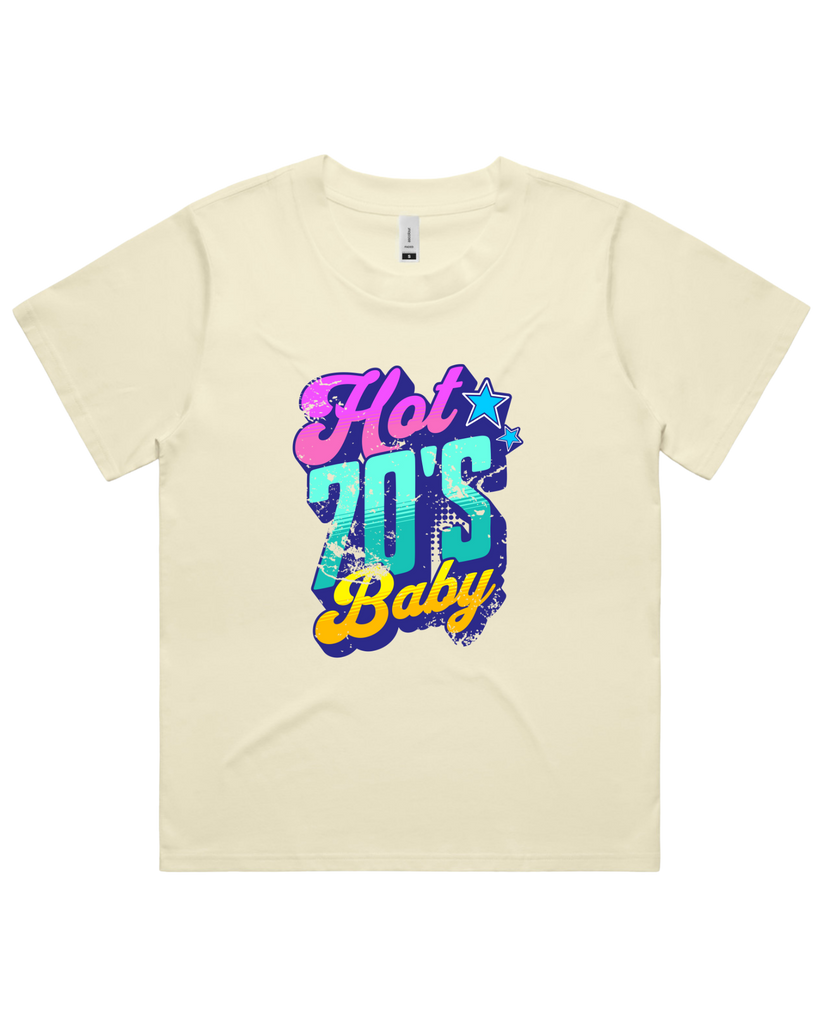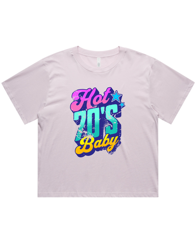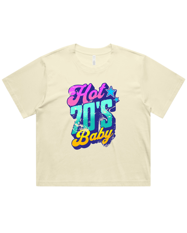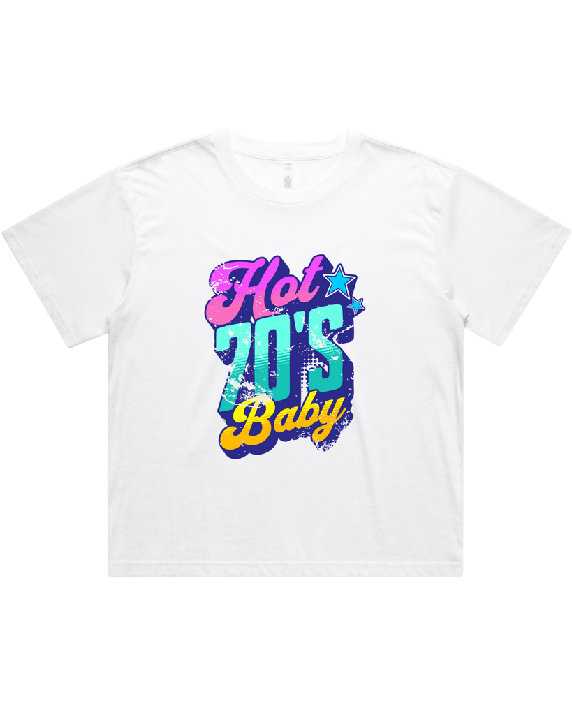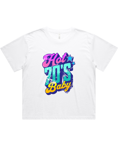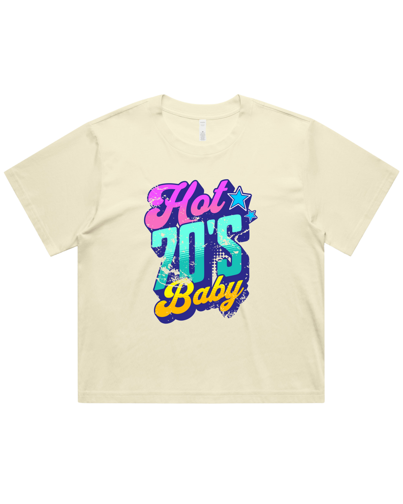 Upgrade your wardrobe with our Womens Hot 70's Baby T-Shirt! Made of 100% combed cotton, this relaxed fit tee features an oversized drop shoulder and a trendy crop top design. The mid-weight fabric ensures comfort while the pre-shrunk design minimizes shrinkage. Size down for a traditional fit. Feel confident and stylish in this must-have piece!